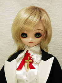 12月25日のドルパ14でお譲りしました。 えーと、今回のDDさんは、オプションヘッドDDH−01アイホールクローズを使ってます。毎度の事ながら、削れるだけ削って、…目はアニメティックアイズの22mmAタイプのわかば色をグルーガンでとめて、睫毛を貼りました。 で、今回からメイクの雰囲気をSD寄りにしています。といっても、ボークスさんから販売されている他のDDさんたちと並べても、そんなに違和感がないように、なおかつ、ののさんとかミミさんとかのSDさんたちと並んでもあまり違和感がないように仕上げてみたつもりです。 |