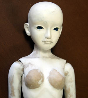 | 乾燥後の削りでは、繊維が絡んでぼろぼろと崩れるのでカッターナイフは使いにくいです。ヤスリやリューターなどで削りだす方がやり易いように感じられました。関節の受け等の整形にはアイベベラーで削る方法が良いようでした。また、関節の受け部分など肉厚の薄い部分の強度アップや精度を出したい部分には、低粘度の瞬間接着剤を吸わせて固める方法が良好でした。細かい細工が必要な部分、たとえば耳や口角とかでは、瞬着を吸わせておいて硬化後、カッターやダイヤモンドビットをつけたリューターで作業を行うといいです。この作業では、やすりは、ダイヤボンドやすり(ダイソーにも売っている柄が赤い目の細かいものがいいです)が使いやすいです。 頭にステンレスの針金で作ったゴム引き用のフック(SDでのSカンみたいな役割をします)を埋め込む場合も、固定に瞬間接着剤が使えたので、簡単にぐらつきも無く固定できます。勿論、針金を埋めた後は粘土で塞いじゃいますから外からは見えなくなりますけど…、楽でいいです。 完全乾燥後の木粉ねんどの接合には、木工用ボンドや瞬間接着剤が使えます。ただし、瞬間接着剤でつけた場合は、その上にラドールなどを盛り上げるには、木工用ボンドを塗ってから盛る必要がありますから、ご注意ください。 4.表面の調整について 水で表面を湿らせた後、ラドールやクロスクレイの盛り上げは可能でした。接合強度もラドール同士とほぼ変わらず、乾燥後はがれるようなことはありませんでした(写真3)。仮に液状胡粉を頭部パーツに塗ってみたのですが、瞬間接着剤を含ませた部分についても液状胡粉ののりは良いみたいです。(写真4) |