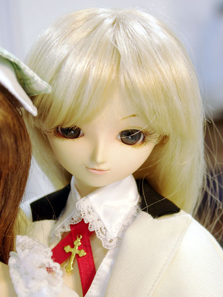■簡単な説明など このSDは、完成SDとして2002年の大名古屋ドールフェスティバルで販売いたしました。このEM02からEM04までの3体は、「ミニSD」が育って「SD」サイズになったらこうなるかいなぁ・・・というコンセプトで製作しています。この子は「マギー」をイメージして、ちょっと垂れ目で微笑んでいる、素直で優しい感じに仕上げてみました。販売時のカスタム内容:13番ヘッド削りだし、20mmグラスアイ(HGタイプ・ダークグレイ)、付け睫毛(上)、エアブラシメイク、ウィッグ(W−4)、ののボディ(パーティングライン除去、関節部シリコンゴムシート貼付け、脚部6mm腕部3.2mm自遊自在組み込み、色調補正)。現在は、オプションパーツでボディを組みなおしてあります。 販売時の説明だと、以下の通り…。 今回グラスアイをグレーに、ウィッグをW−4にしました。メイクはMr.カラーをエアブラシで吹いてあります。だいたいサーティーンシリーズのデフォルトに近い感じの、ナチュラルメイクで仕上げています。シャドウの上にクリア層を重ねて、軽く研ぎ出しした後トップコートに艶消しクリアを重ねています。名前はベタですけど、仮称で「13マギー」・・・mini SDのマギーが13になたらこんな感じかなぁと。でも、ボディは13シリーズじゃなくて「のの」のボディですけど。最終調整でメイクをちょっとだけいじって、少しだけお姉さんにしました。カスタムした普通肌のSD−F−13ヘッド・写真のウィッグ・写真のグラスアイを、間接部に滑り止めのシリコンゴムシートを張り付けて、自遊自在を組み込んだ「のの」ボディと合わせて組み立てた状態で、SDの箱と布団を付けてのお渡しです。(あーなげぇ)ボディは、とりあえずパーティングラインを消してあり、爪はクリアピンクに塗装してます。ボディのコーティングは、かえって汚れを吸着しやすくなって手入れが面倒になるのでしていません。また脚部に6mm、腕部に3.2mmの自遊自在を入れてあるので、ポージングをなんとか保持することが出来ます。それとグラスアイは、練り消しゴムで固定してあるので、交換したり目線の変更は簡単にできます。ウイッグは両面テープで仮止めしています。一応、衣装や靴、スタンドは付属しません。実物を見て気に入ったら買ってください。それと、衣装は別途、他のディーラさんからお買いあげ下さい。 |